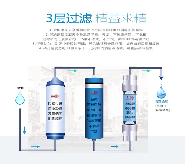 (2)、解決高低度酒天冷易起懸浮物、沉淀、不抗凍問題,可保證過濾后的低度酒在零下15度不渾濁,不沉淀,保持100%清澈透明。