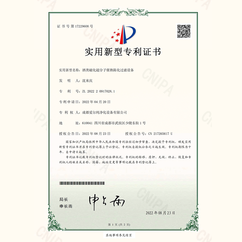二、過濾后在保持酒體香酯成分不損傷的情況下,去除酒體中的苦味,異雜味,爆辣味,怪味及酒中異香,催熟后酒體無苦味,異雜味,爆辣味,酒體香氣純正,口感綿柔,協(xié)調(diào),爽凈,醇厚,可達(dá)到三年以上自然老熟陳化口感。